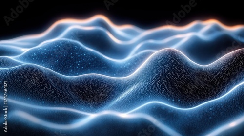 Abstract digital landscape of glowing blue waves forming smooth hills against a dark background with subtle orange highlights