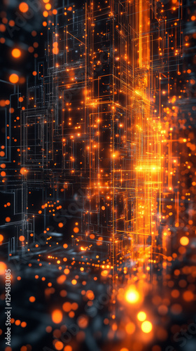 Abstract digital network illuminated with bright, orange glowing particles creating a futuristic and technological atmosphere.