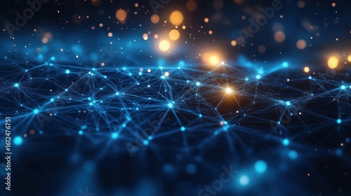 Abstract digital network of interconnected glowing blue nodes and lines with warm golden bokeh lights in background