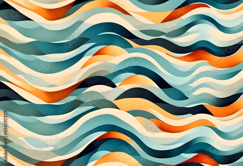 Abstract digital painting with flowing, layered waves in shades of blue, teal, and orange.