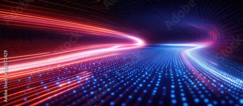 abstract, digital, tunnel, light, trail, network, dot, red, blue, glowing, technology, speed, energy, futuristic, science, datum, innovation, motion, line, curve, path, flow, connectivity, dynamic, modern, visualisation, digital artwork, abstract art, background, design, illustration, graphic, cosmic, space, velocity, virtual, cyber, neon, wave