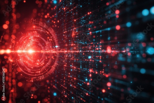 Abstract digital tunnel with red and blue glowing particles and light streaks.