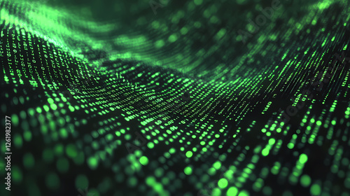 green, abstract, digital, wave, binary, code, flow, dynamic, light, dark, shimmer, technology, futuristic, background, blur, grainy, texture, sharpened, datum, stream, glowing, vibrant, neon, circuit, pattern, motion, ripple, signal, matrix, pixel, depth, contrast, luminescent, oscillation, spectrum, pulse, rythm, sequence, transmission, visualisation, algorithm, cybernetic, holographic, monochrome, overlay