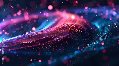 Abstract digital wave with glowing particles in pink and blue colors creating dynamic motion effect. Perfect for technology, innovation, and modern design backgrounds.
