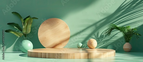 Abstract empty podium with wooden geometric shapes set against a green background Template for showcasing products. Copy space image. Place for adding text and design
