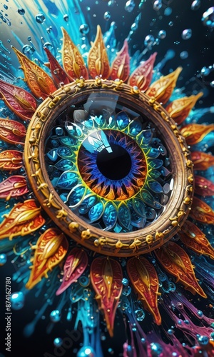 Abstract Eye with Colorful Flower Pattern and Water Droplets.