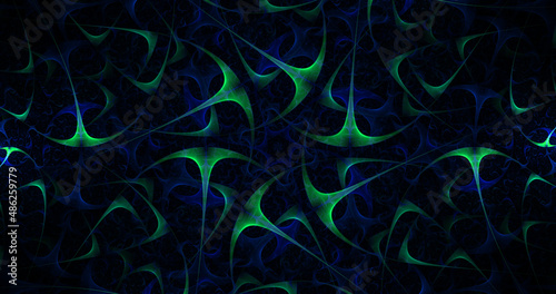 Abstract fantastic fractal background of intertwining glowing blue and green shapes. Digital fractal art. 3d rendering.