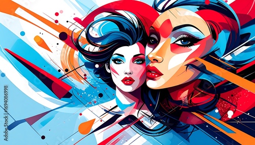 abstract, face, woman, colourful, geometric, portrait, bold, vibrant, dynamic, style, artistic, modern, shape, line, colours, red, blue, orange, yellow, design, art, illustration, composition, fashion, make-up, creative, expression, stylish, hair, visually