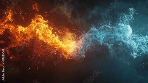 fire, water, collision, abstract, spark, flames, splash, heat, cold, contrast, energy, clash, motion, dynamic, vibrant, artistic, texture, background, design, graphic, digital, artwork, illustration, pattern, swirl, flow, light, dark, intense, dramatic, bright, blue, orange, yellow, red, black, white, smoke, steam
