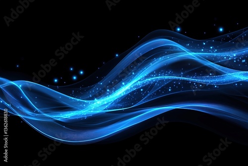 Abstract Flowing Blue Lines with Glittering Particles on Dark Background, Neon Style