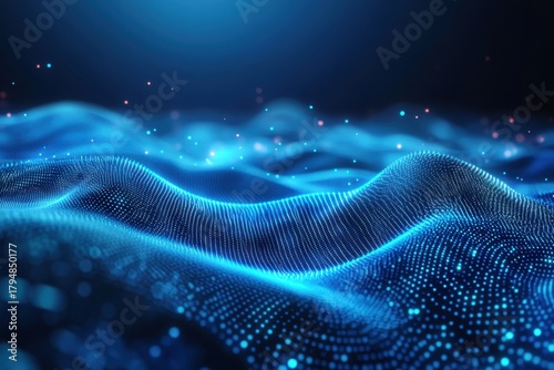 Abstract flowing mesh wave surface with a bright blue light burst. High-speed network data transfer and signal flow. Futuristic technology background illustrating connected ...