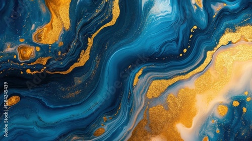 Abstract fluid art, deep blue and gold, flowing swirls, background design