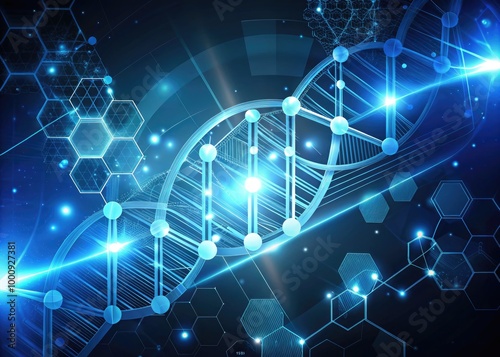 Abstract futuristic blue and white infographic design featuring DNA helix, molecules, and technology-inspired shapes on a dark background for scientific and technological concepts.