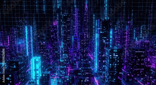 abstract, futuristic, city landscape, night, glowing, neon, blue, purple, digital, datum, stream, technology, cyberspace, virtual, reality, network, connection, cyberspace, server, computer, graphic, design, modern, urban, building, skyscraper, light, vibrant, energy, motion, speed, matrix, code