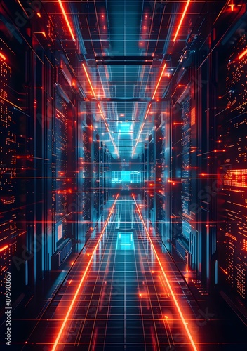 Abstract Futuristic Cyberspace Corridor with Red and Blue Neon Lights