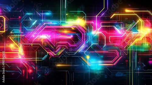 abstract, futuristic, digital, circuitry, neon, line, vibrant, colours, glow, bright, dark, background, technology, pattern, design, graphic, illustration, modern, art, style, concept, electronic, network, connection, datum, flow, signal, interface, screen, light, shadow, texture, pixel, grid, wire, cable, energy, power, speed, motion, dynamic