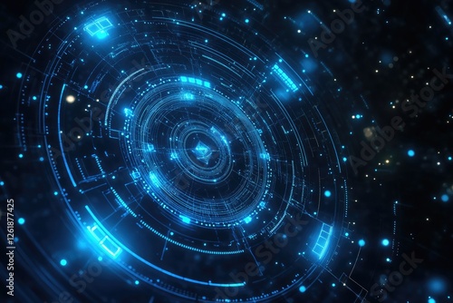 Abstract futuristic digital interface, glowing blue, circular pattern, network background
