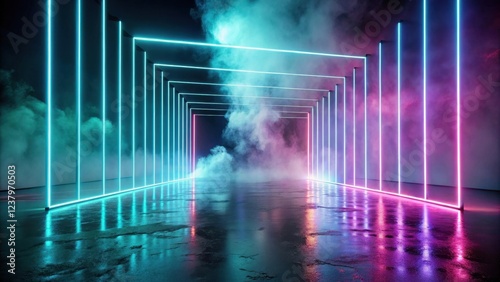Abstract Futuristic Neon Corridor with Vibrant Glowing Lines and Atmospheric Haze Reflecting on Wet Floor