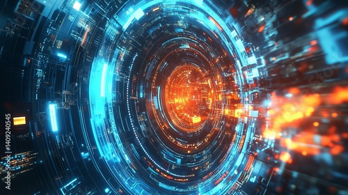 Abstract futuristic technology tunnel with bright neon blue and orange lights art data speed vivid