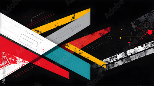 abstract, geometric, composition, arrow, shape, texture, pattern, white, red, yellow, teal, dynamic, motion, design, overlapping, background, paint, splatter, depth, artistic, clean, line, industrial, aesthetic, balance, precision, chaotic, energy, modern, edgy, striking, bold, textured, layered, contrast, vibrant, expressive, visual, modernism, sharp, angular, rough, vector, arrow, signs, illustration, business, concept, art