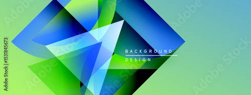 Abstract geometric shapes blend vibrant blues, greens. Modern design suggests depth, movement, dynamic visual experience. Background features text elements.