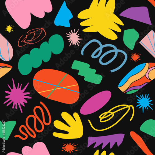 Abstract geometric shapes.Seamless pattern various shapes, swirls, shapes, stars, lines and circles and doodle objects. Abstract modern minimalist fashion.Vector background with wavy and spiral elemen