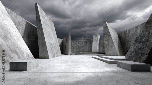 abstract, geometric, structure, stone, architecture, sky, cloud, stormy, dark, grey, white, building, exterior, landscape, design, art, modern, minimalist, block, angular, composition, texture, pattern, form, shape, line, perspective, depth, contrast, shadow, light, daylight, environment, conceptual, digital, render, three-dimensional, artwork, background, element, visual, creative, style, surface, rough, weather, mood, space