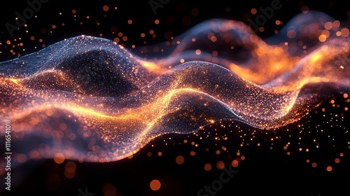 abstract, background, wave, glistering, sparkle, energy, flow, motion, particle, light, bokeh, texture, design, digital, art, futuristic, cosmic, nebula, orange, gold, dark, night, elegant, luxury, shimmer, glowing, vibrant, dynamic, illuminated, seamless, pattern