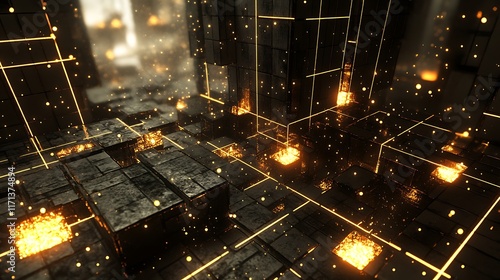 abstract, background, black, block, bright, cube, dark, design, digital, energy, futuristic, geometric, glow, gold, grid, illuminated, light, line, metallic, network, orange, pattern, particle, perspective, shining, sparkle, space, structure, technology, texture, three, dimensional, virtual, earth, yellow