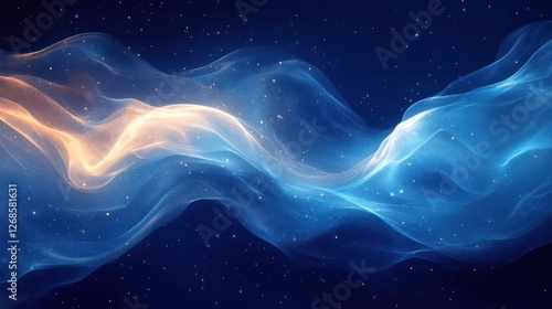Abstract glowing wave, blue and orange light, dark background, sparkle.