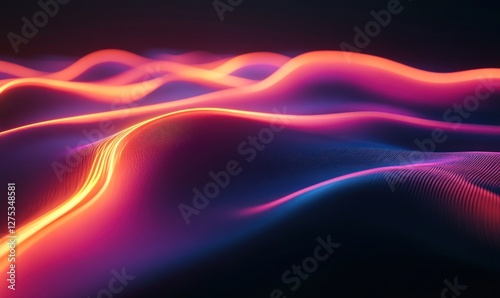 wave, abstract, landscape, glow, light, neon, energy, vibrant, colours, digital, art, design, futuristic, technology, background, texture, pattern, motion, dynamic, flow, curve, ripple, surface, smooth, bright, dark, red, orange, pink, blue, purple, gradient, illuminated, particle, line, graphic, illustration, three-dimensional, render, style, modern, concept, fantasy, scene, space, cosmos, shiny, glowing