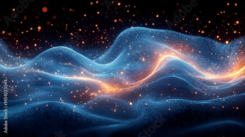 wave, particle, abstract, light, glow, energy, blue, orange, spark, glistering, cosmic, nebula, space, night, dark, texture, background, design, futuristic, fantasy, vibrant, bright, motion, flow, dynamic, digital, art, illustration, science, technology, elegant, mystical, magical, shimmer, shine, luxury, smooth, curve, ripple, gradient, pattern, effect