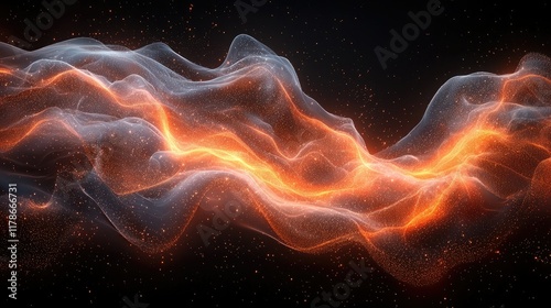 abstract, wave, orange, white, particle, glowing, light, energy, flow, motion, dynamic, cosmic, nebula, space, dust, spark, fiery, heat, bright, shimmer, glistering, texture, background, design, art, digital, illustration, fantasy, mystical, aethereal, vibrant, intense, dark, night, celestial, galaxy, star, universe, pattern, gradient