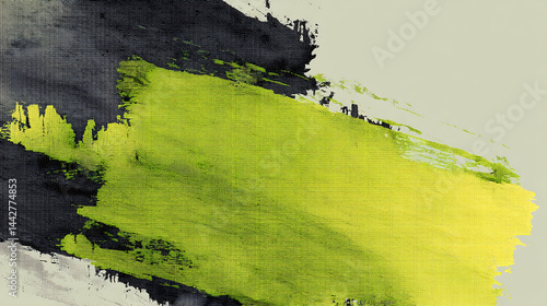 Abstract green paint stroke with black and white textured background, artistic ink bleed effects create dynamic and vibrant composition with controlled edges and opacity