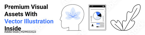 Abstract head outline with a leaf, smartphone displaying analytics dashboard, stylized leaf graphic. Ideal for wellness, analytics, innovation, creativity, digital tools, design flat landing page