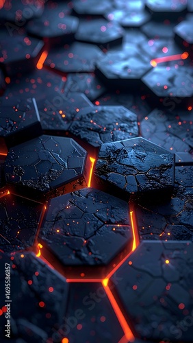 abstract, hexagon, grid, geometric, pattern, neon, glowing, light, dark, technology, futuristic, digital, modern, science fiction, energy, power, connection, network, structure, texture, closeup, macro, depth of field, computer graphic, illustration, background, wallpaper, design, innovation, concept, visual, vibrant, dynamic, blue, red, orange, black, polygonal, digital artwork, artificial intelligence, datum, code, gaming