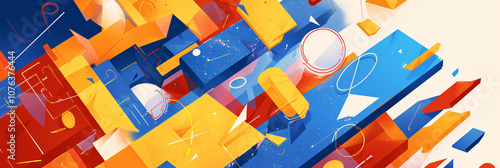 Abstract illustration displaying a colorful composition of geometric shapes in blue, orange, and yellow against a light background, creating a playful and modern visual for design.