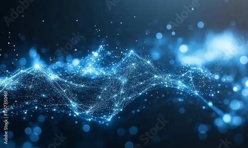 Abstract illustration featuring plexus blue geometrical shapes, representing connection and web concept, with digital communication and technology network background comprising moving lines and dots