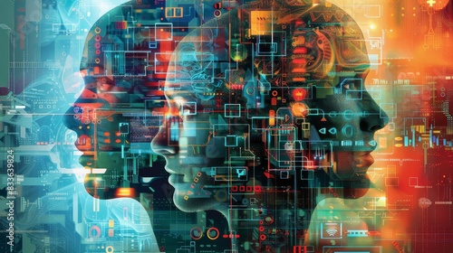 abstract, illustration, human, profile, merge, technology, symbolize, ai, transformation, colourful, dimension, pixel, innovation, artwork, vector, intelligence, techno, visual, dynamism, network, fusion, virtual, machine, depiction, modern, interface, portrait, connection, creation, graphic, synthesis, artificial, computer, fantasy, element, cognition, progress, avatar, cyberspace