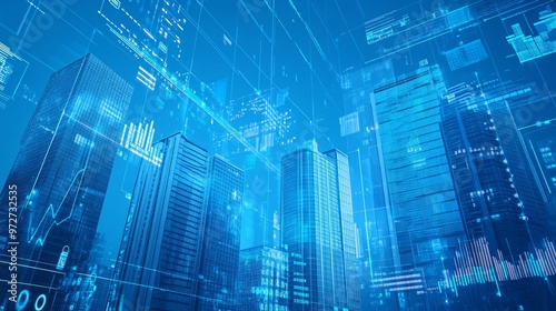 Abstract image of buildings overlaid with financial data graphs, symbolizing real estate market analysis on a blue background