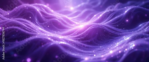 Abstract image of glowing waves with a dreamy, purple light, scattered with twinkling particles. The soft, flowing movement creates a calming and otherworldly atmosphere, perfect for futuristic