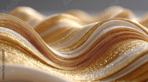 gold, white, stripes, wave, undulation, texture, abstract, art, design, metallic, shimmer, glistering, glossy, luxurious, elegant, smooth, flowing, curve, pattern, background, ripple, fold, layer, material, surface, light, shadow, three-dimensional, render, digital, graphic, illustration, style, modern, contemporary, beauty, opulent, rich, sophisticated, vibrant, dynamic, lustrous, shimmery, sparkling, gleam