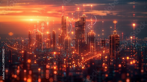 Abstract industrial landscape with glowing tech symbols and holographic elements showcasing advancements in technology and science. , Minimalism,