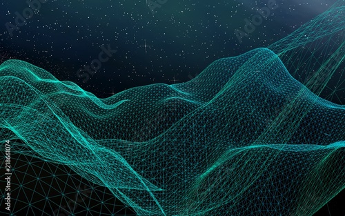 Abstract landscape on a dark background. Star horizon. Cyberspace grid. Hi-tech network. Outer space. Starry outer space texture. 3D illustration