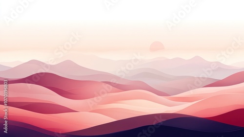 Abstract landscape with pink, red and purple mountains in the distance with a sun in the horizon.