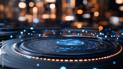 Abstract light display featuring illuminated circular shapes and glowing particles against a blurred city background at night