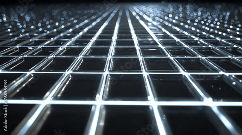 Abstract metallic grid with glowing lines, creating a mesmerizing pattern of light and shadow