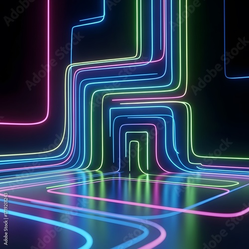 abstract, neon, light, tube, futuristic, tunnel, reflections, dark, surface, glowing, line, pattern, design, modern, digital, art, background, illumination, energy, vibrant, colours, blue, pink, green, purple, cyan, magenta, electric, bright, smooth, curved, geometric, structure, path, way, motion, speed, flow, network, circuit, datum, cyber, tech, science, space, dimension, abstracted, visual, graphic