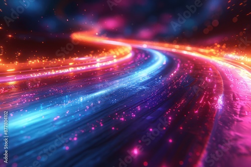 abstract, neon, light, trail, curved, path, digital, art, glowing, blue, pink, orange, hue, vibrant, composition, light, effect, graphic, design, background, texture, futuristic, technology, dark, night, sparkle, pattern, dynamic, energy, movement, blur, bright, high-coloured, modern, style