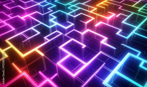 abstract, background, neon, labyrinth, rainbow, colours, line, geometric, pattern, design, texture, three-dimensional, render, glowing, bright, vibrant, colourful, light, energy, technology, futuristic, modern, graphic, illustration, digital, art, style, complex, intricate, network, connection, circuit, electronic, structure, shape, cube, box, grid, pathway, labyrinth